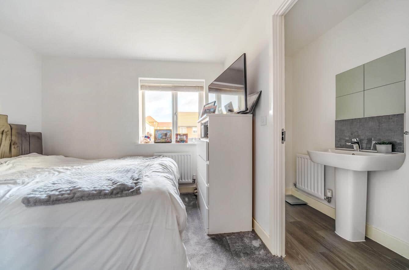Upstairs the house features two double bedrooms, the main with a modern ensuite shower room providing a touch of luxury, the second with a storage cupboard, and a good sized modern family bathroom.