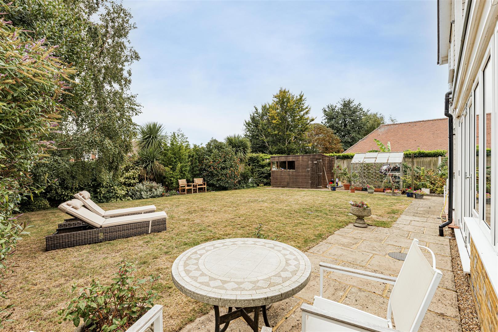 Outside, the mature and established garden is a true sanctuary, featuring a vegetable patch, a patio area for al fresco dining, a lush lawn, a greenhouse, and a shed for storage. The property also benefits from generous parking facilities, accommodating up to six vehicles, along with a double garage.