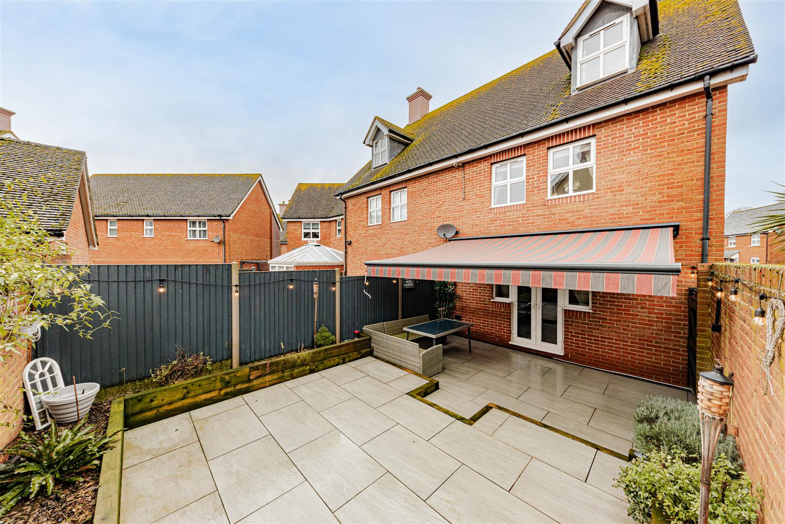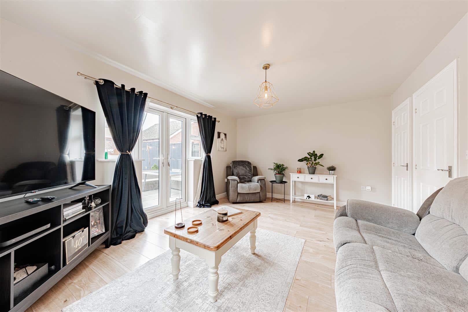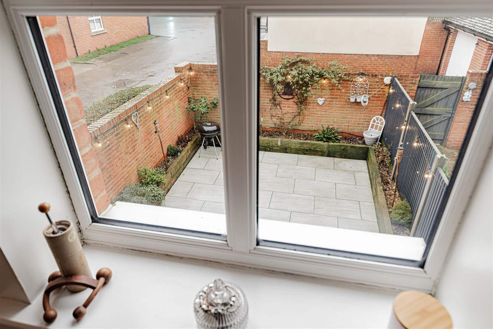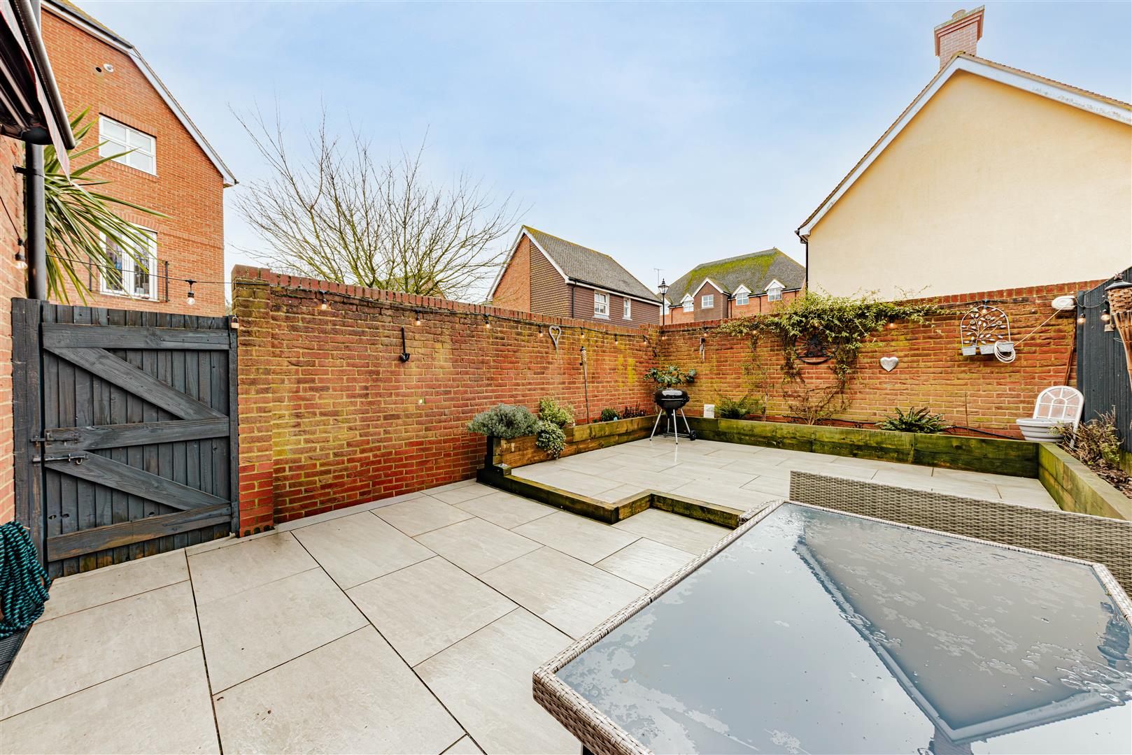 Upon entering the property, you are welcomed into a contemporary kitchen that is both stylish and practical, featuring integrated appliances and space for a dining table. To the rear, a bright and spacious lounge features patio doors that open onto a sunny, low-maintenance garden. The garden is fully paved, attractively edged with wooden planters, and includes an electric awning, making it an ideal space for family life and entertaining.