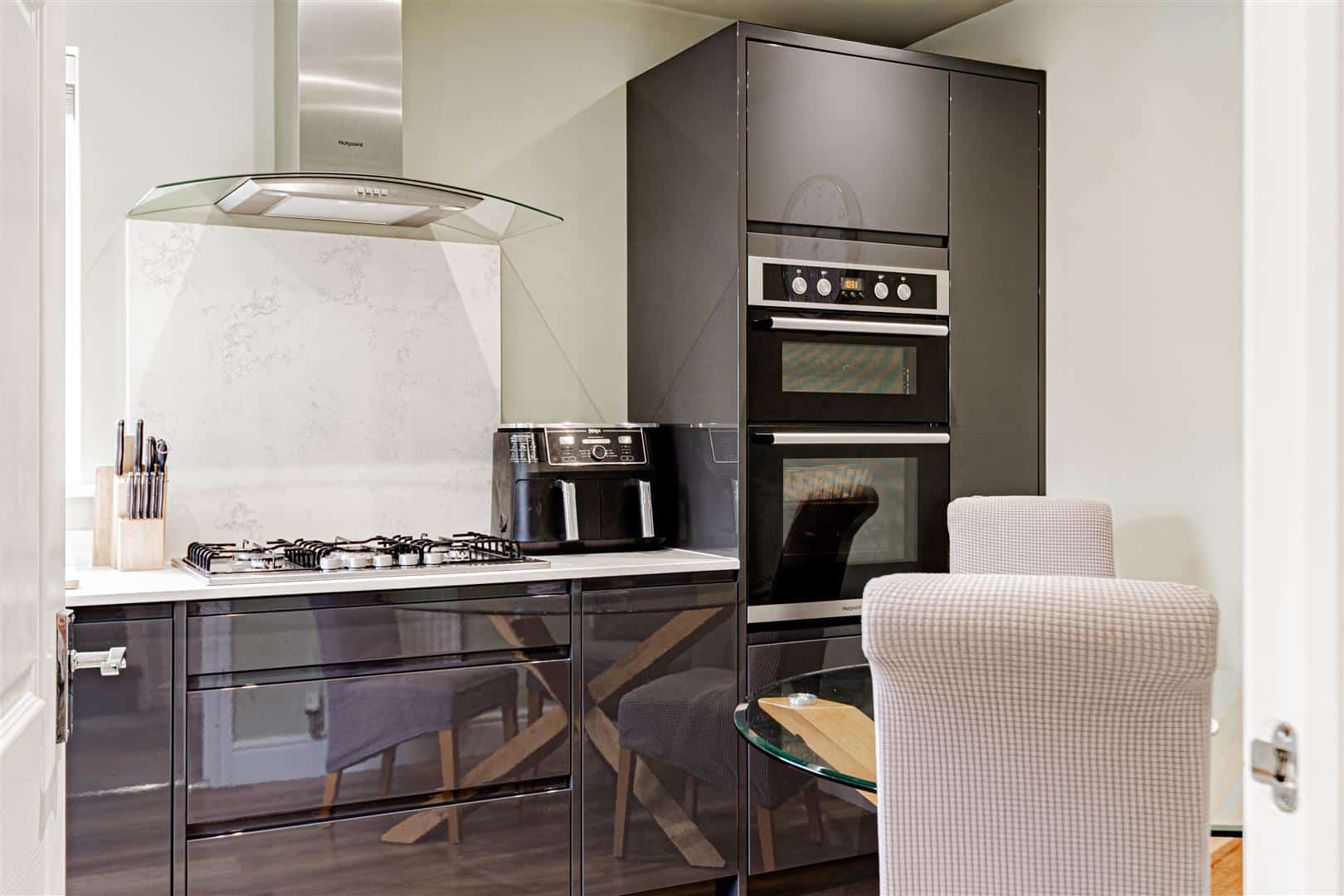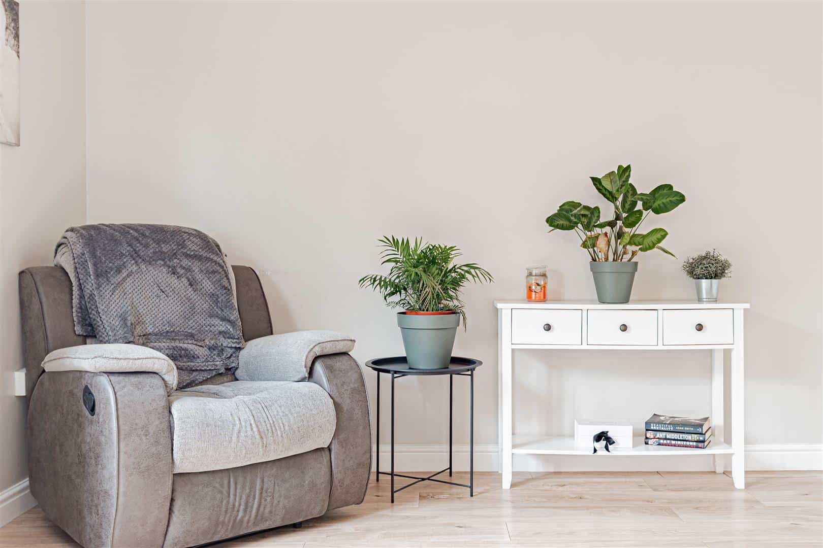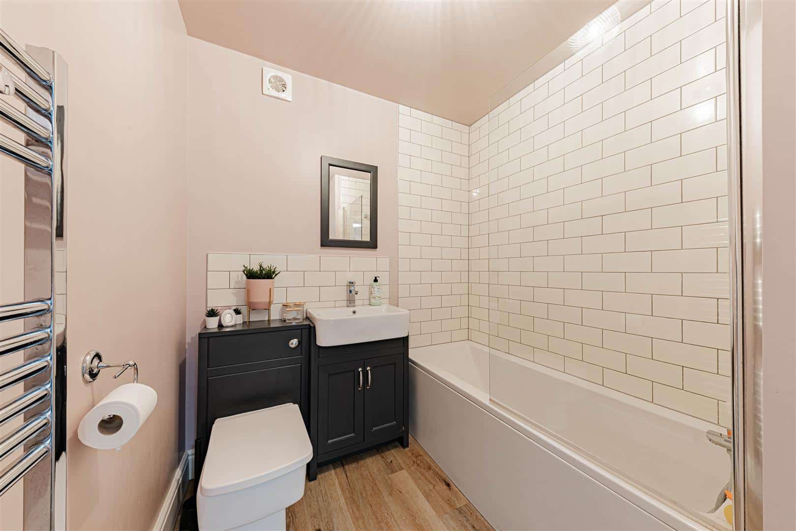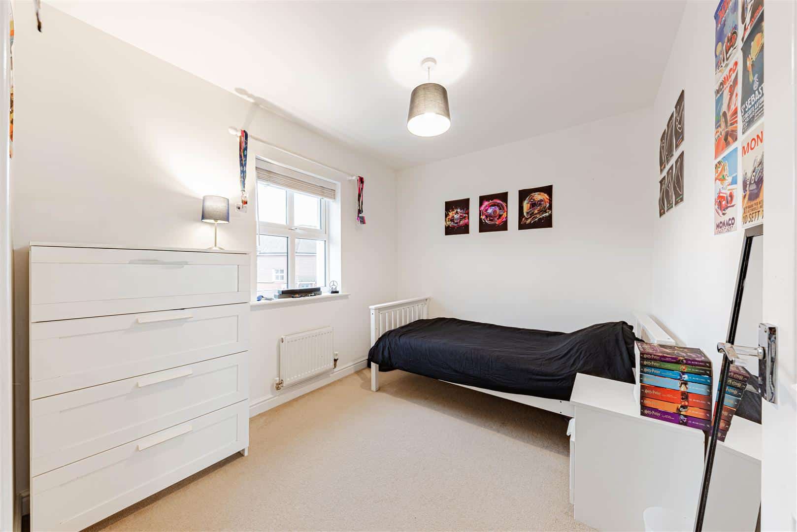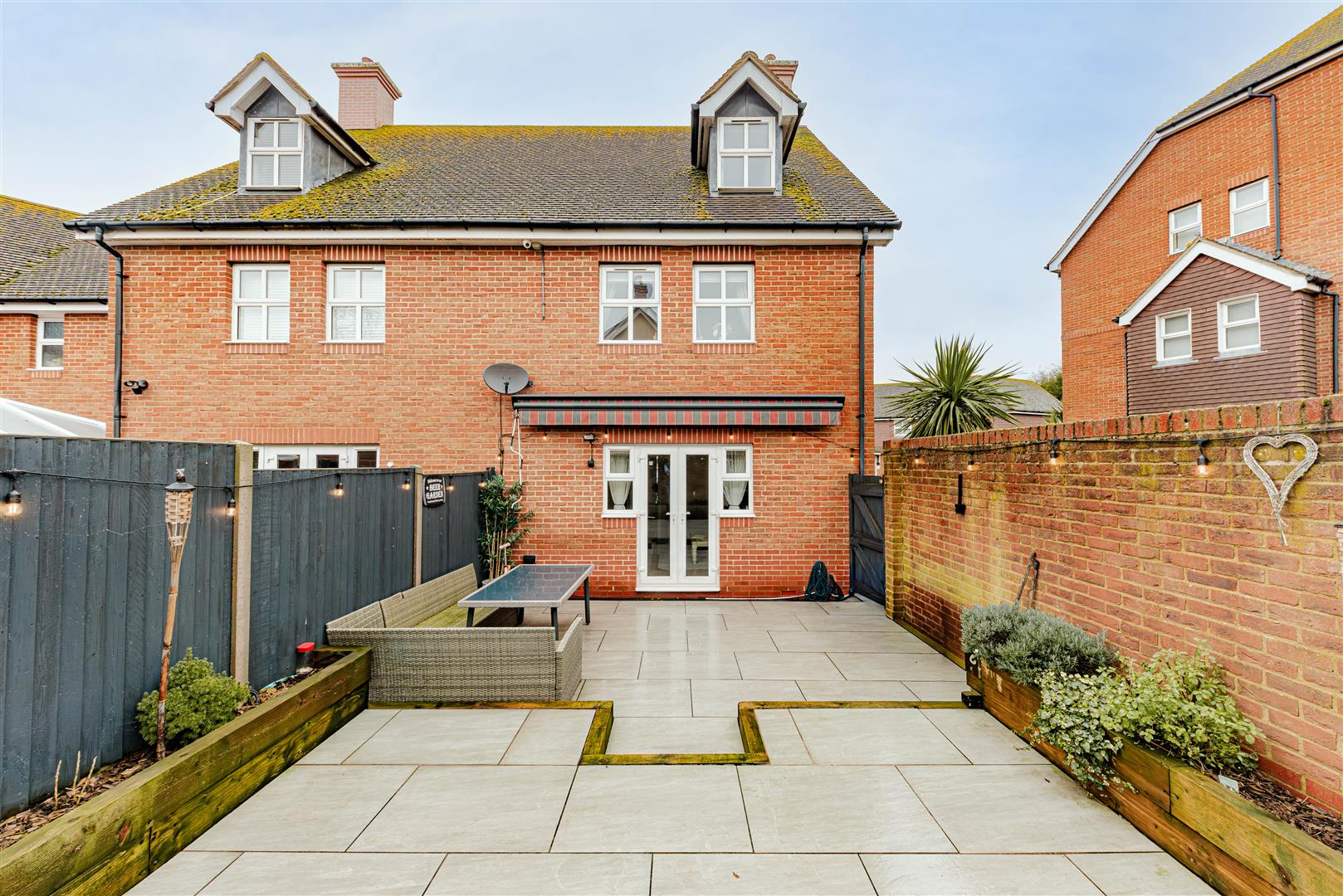 Upon entering the property, you are welcomed into a contemporary kitchen that is both stylish and practical, featuring integrated appliances and space for a dining table. To the rear, a bright and spacious lounge features patio doors that open onto a sunny, low-maintenance garden. The garden is fully paved, attractively edged with wooden planters, and includes an electric awning, making it an ideal space for family life and entertaining.