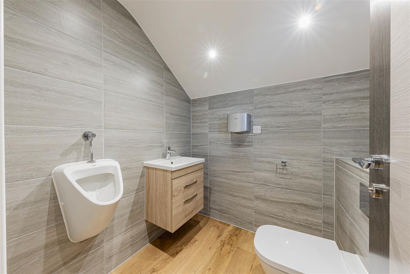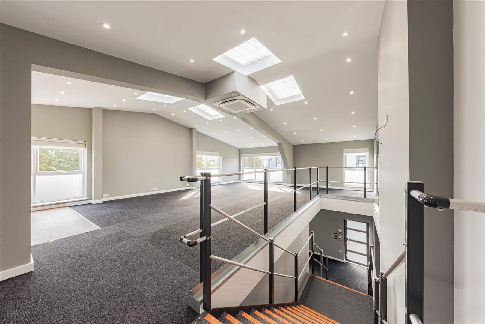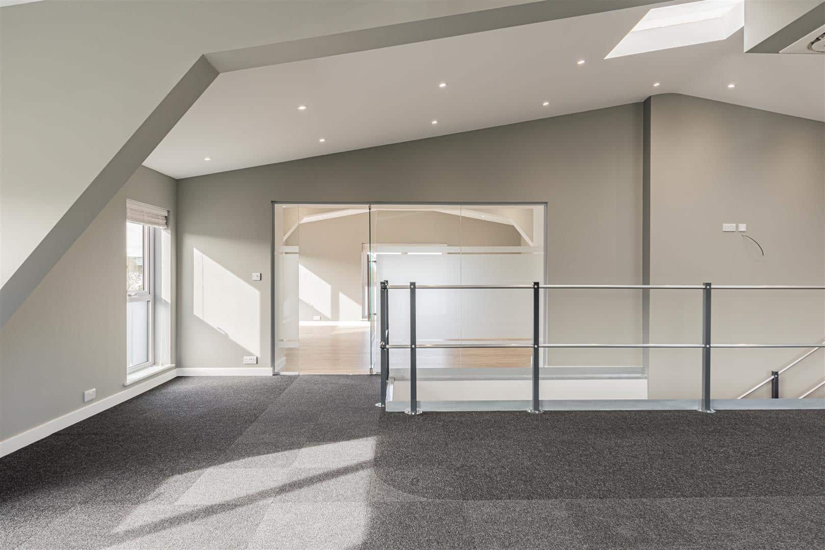 The first floor continues the high-quality finish, offering a large open-plan office area benefitting from excellent natural light from generous windows and roof lights. A private office or meeting room, enclosed with sleek glass partitioning, provides an ideal space for confidential discussions or management use while maintaining a sense of openness within the workspace. Upstairs also includes a fitted kitchen area, complete with modern cabinetry and work surfaces, offering staff a convenient and comfortable breakout space. Female toilet and shower facilities are also located on this level.