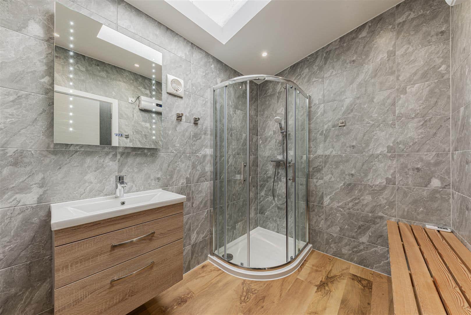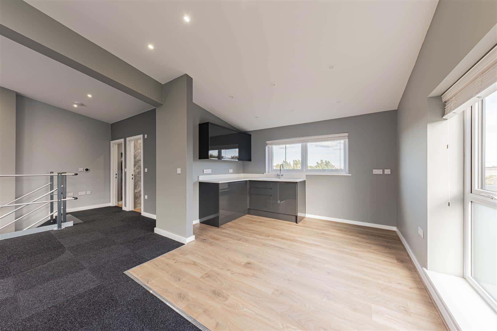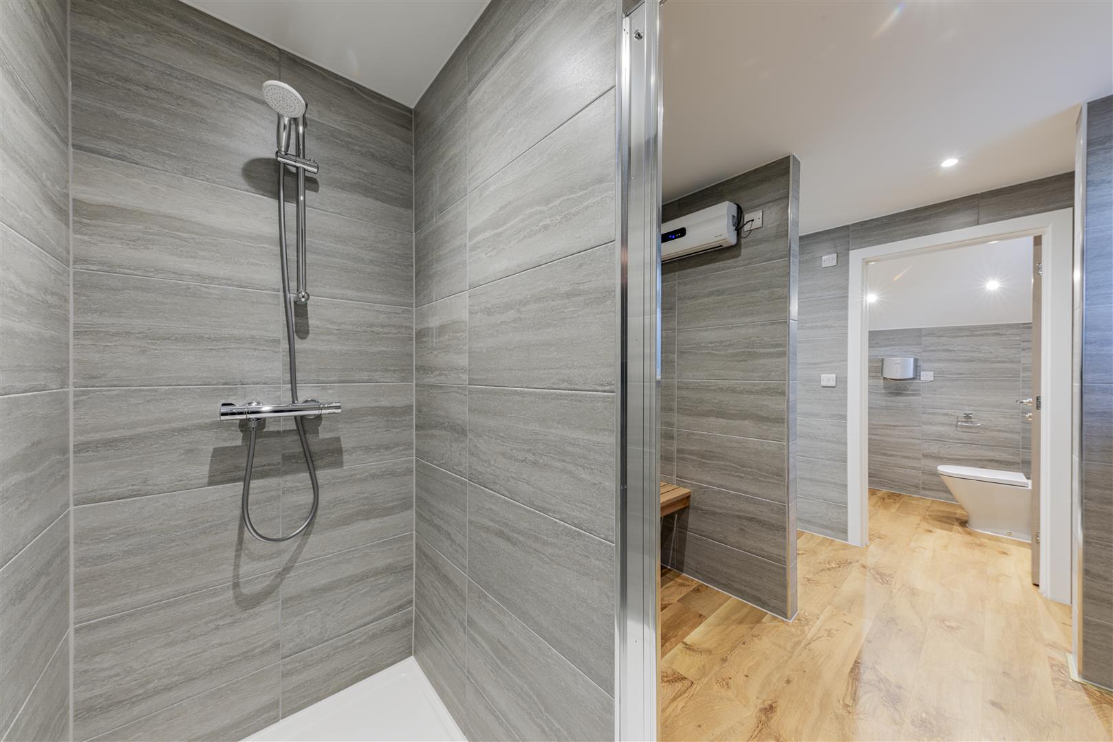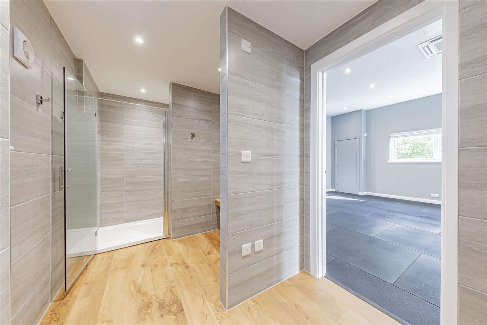 The first floor continues the high-quality finish, offering a large open-plan office area benefitting from excellent natural light from generous windows and roof lights. A private office or meeting room, enclosed with sleek glass partitioning, provides an ideal space for confidential discussions or management use while maintaining a sense of openness within the workspace. Upstairs also includes a fitted kitchen area, complete with modern cabinetry and work surfaces, offering staff a convenient and comfortable breakout space. Female toilet and shower facilities are also located on this level.