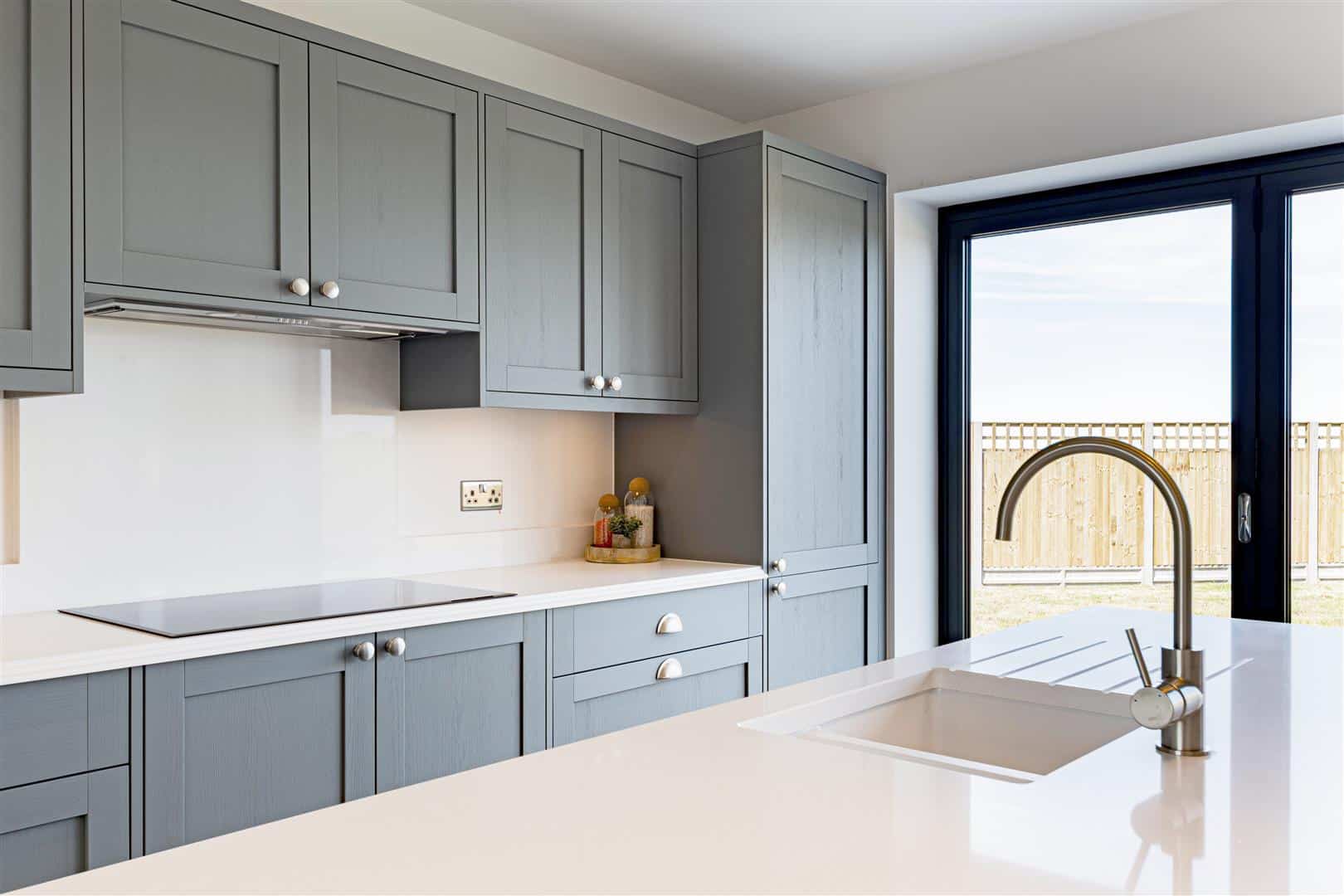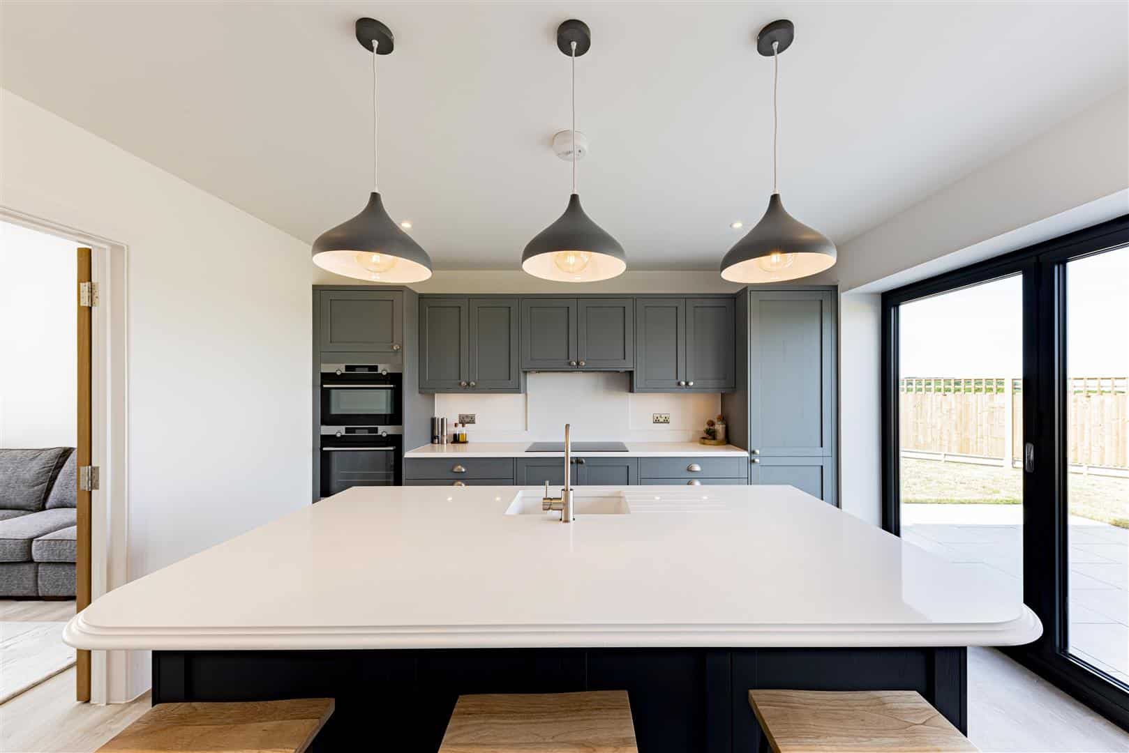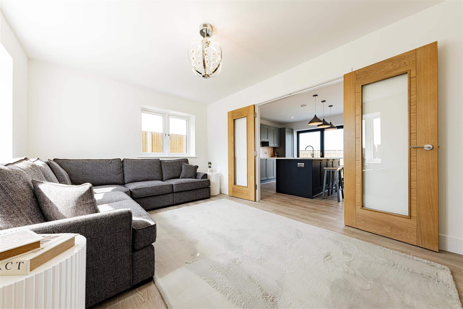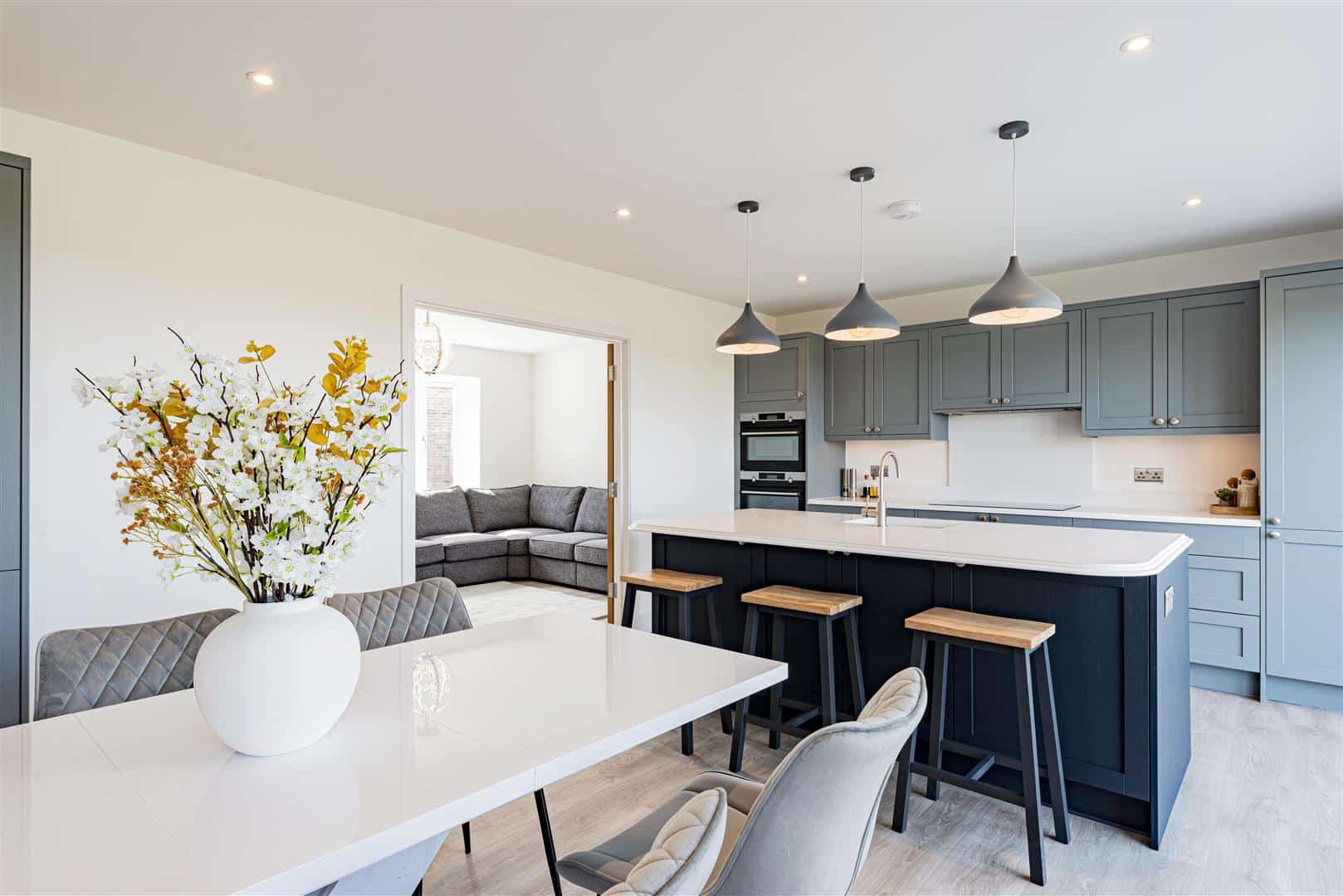 Inside, a bright entrance hallway leads to the heart of the home: a spacious open-plan kitchen, dining, and living area, perfect for family life and entertaining. The kitchen features shaker-style cabinetry, quartz worktops, a central island, and integrated appliances, while bi-fold doors open to the garden, framing spectacular countryside views.