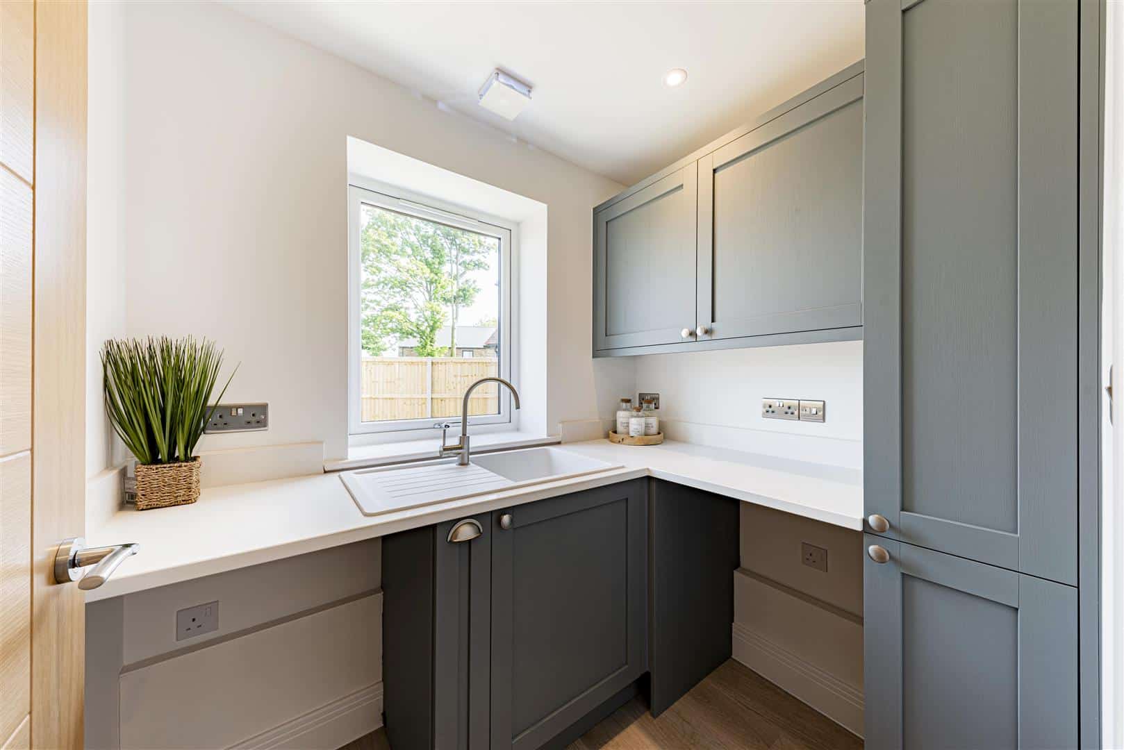 A separate utility room, dual-aspect reception room ideal for dining or quiet relaxation, cloakroom, and integrated garage with underfloor heating complete the ground floor.