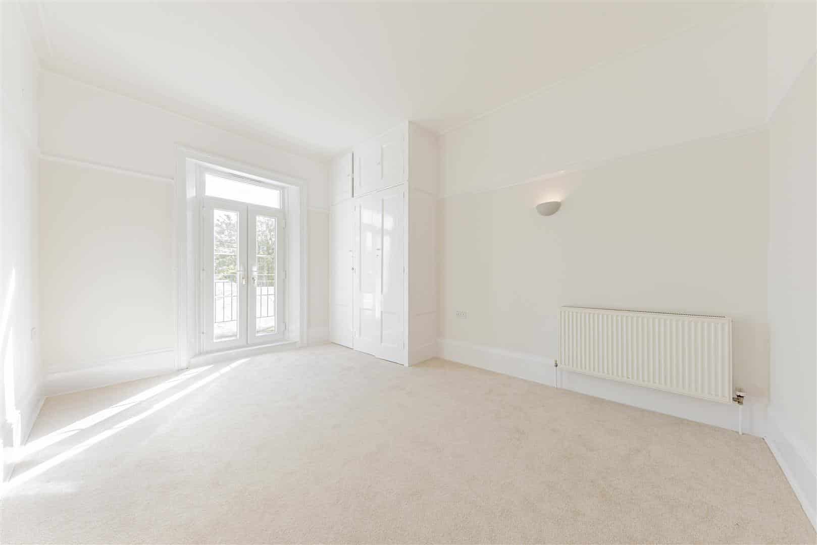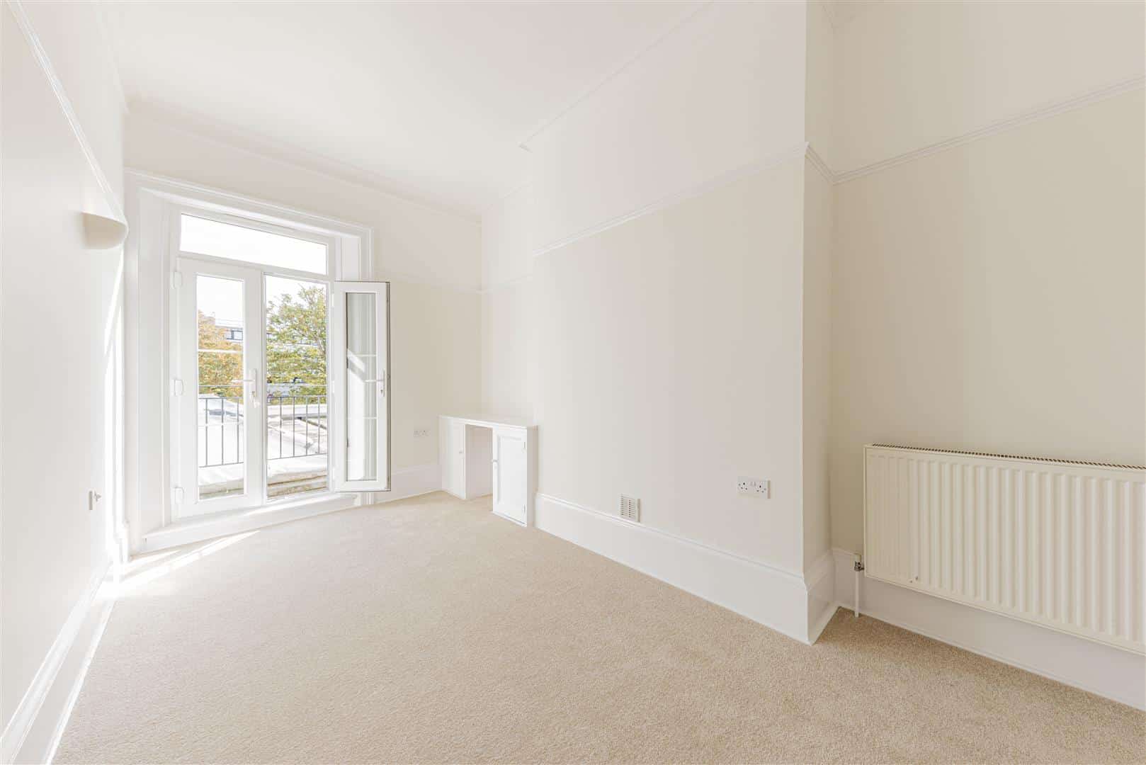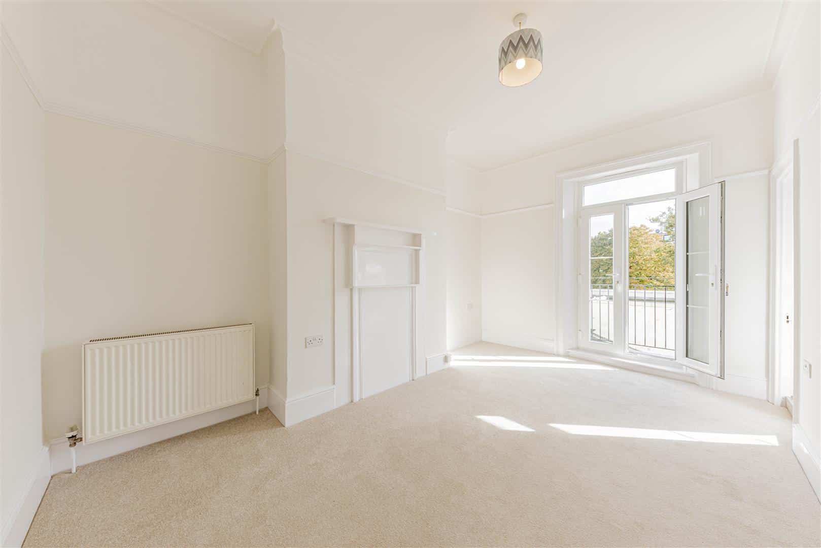 Inside, the apartment features a light-filled lounge, with original feature fireplace and doors leading out onto the balcony.