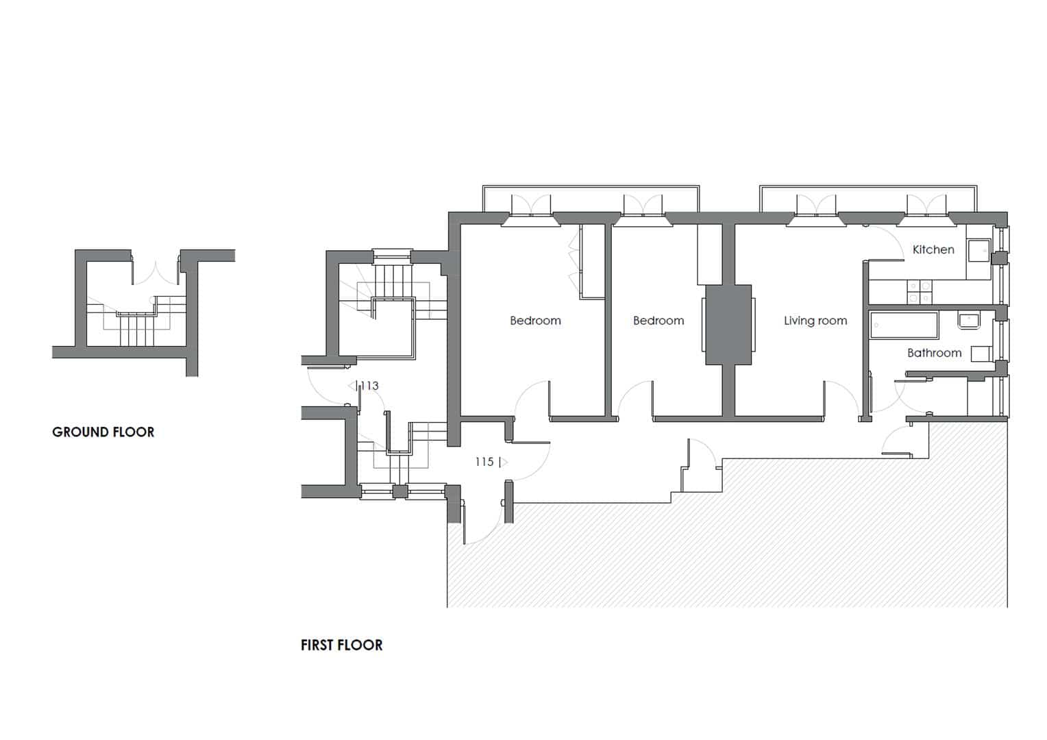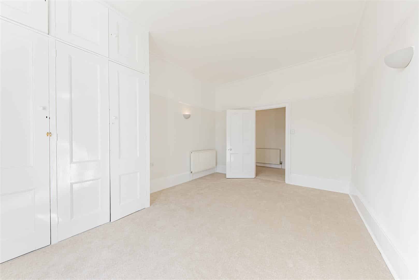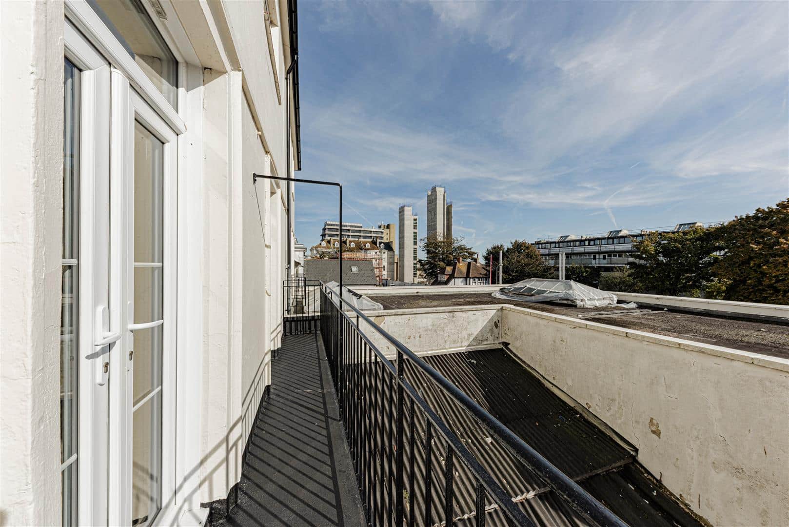 Inside, the apartment features a light-filled lounge, with original feature fireplace and doors leading out onto the balcony.
