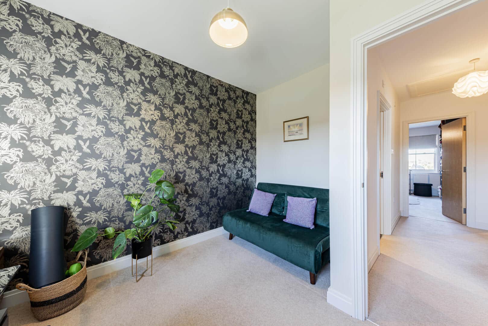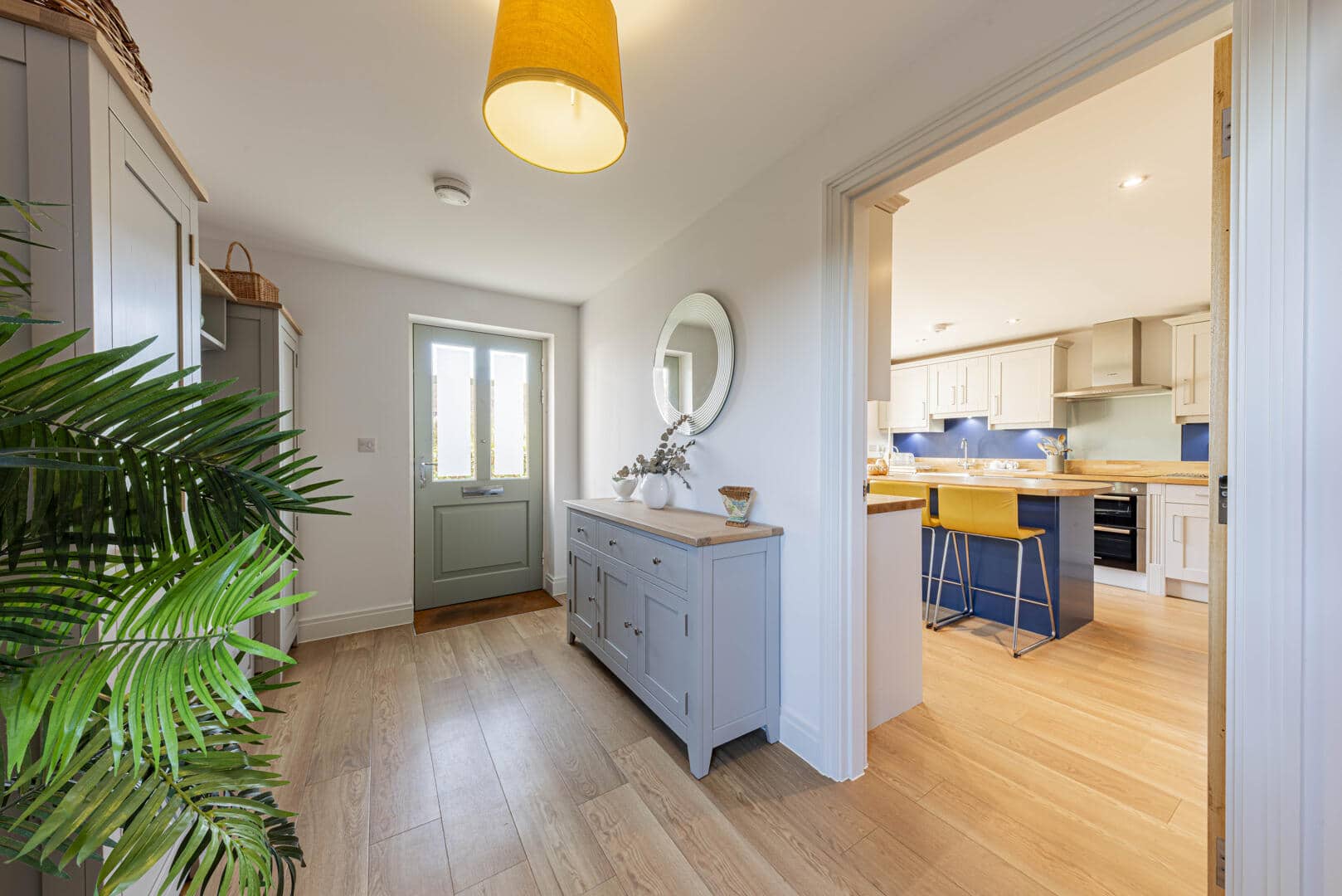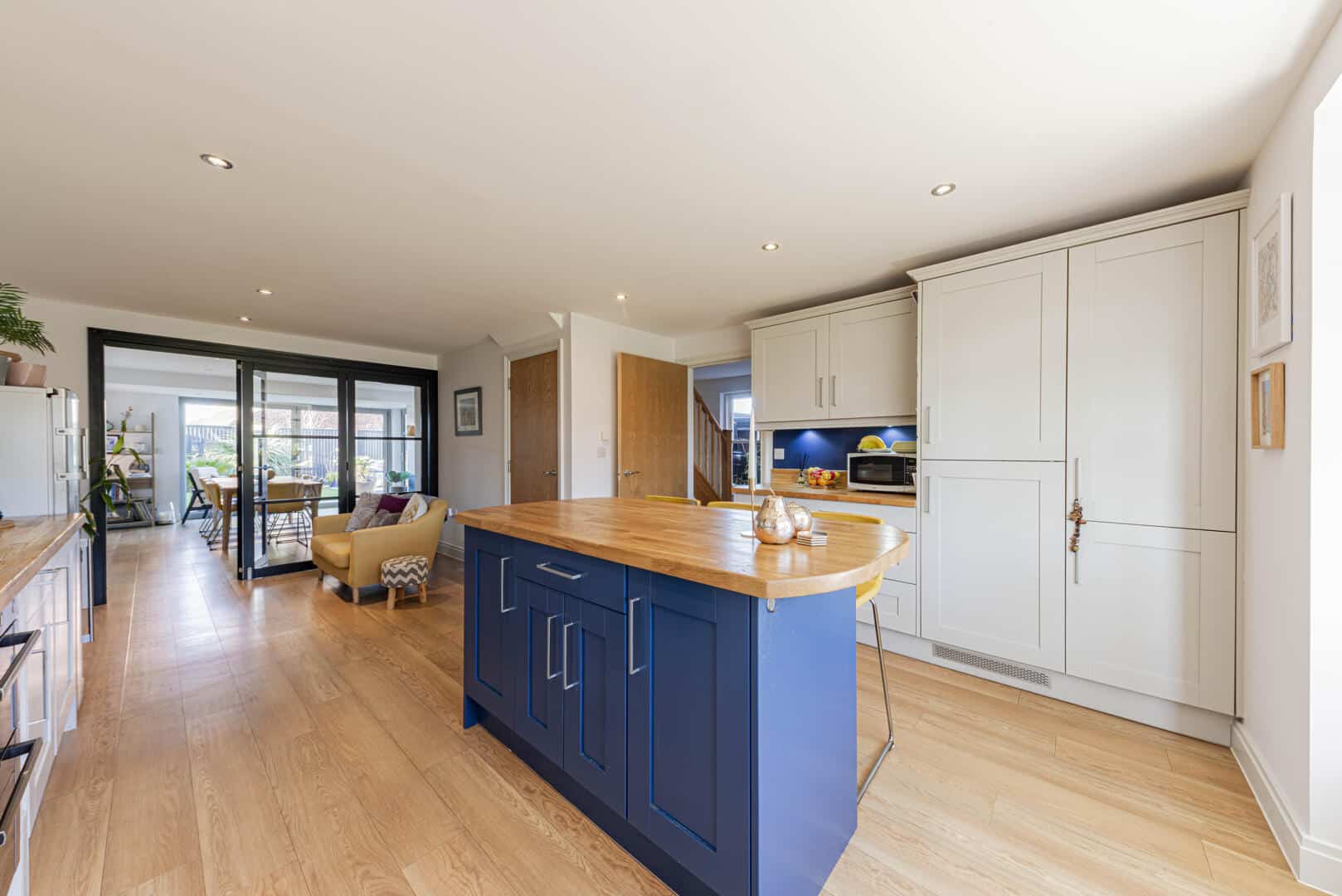 The modern kitchen is fitted with integrated appliances that make everyday cooking a pleasure. In the lounge, bifold doors open directly onto the garden, offering an effortless transition between indoor and outdoor living, perfect for relaxing or entertaining.