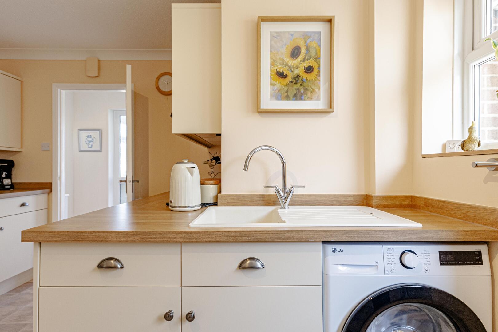 It has a bright and airy living room that enjoys plenty of natural light throughout the day, ideal for relaxing, reading, or entertaining friends and family. The modern fitted kitchen has been designed for both practicality and style, featuring contemporary units, an integrated fridge, and space for additional appliances.