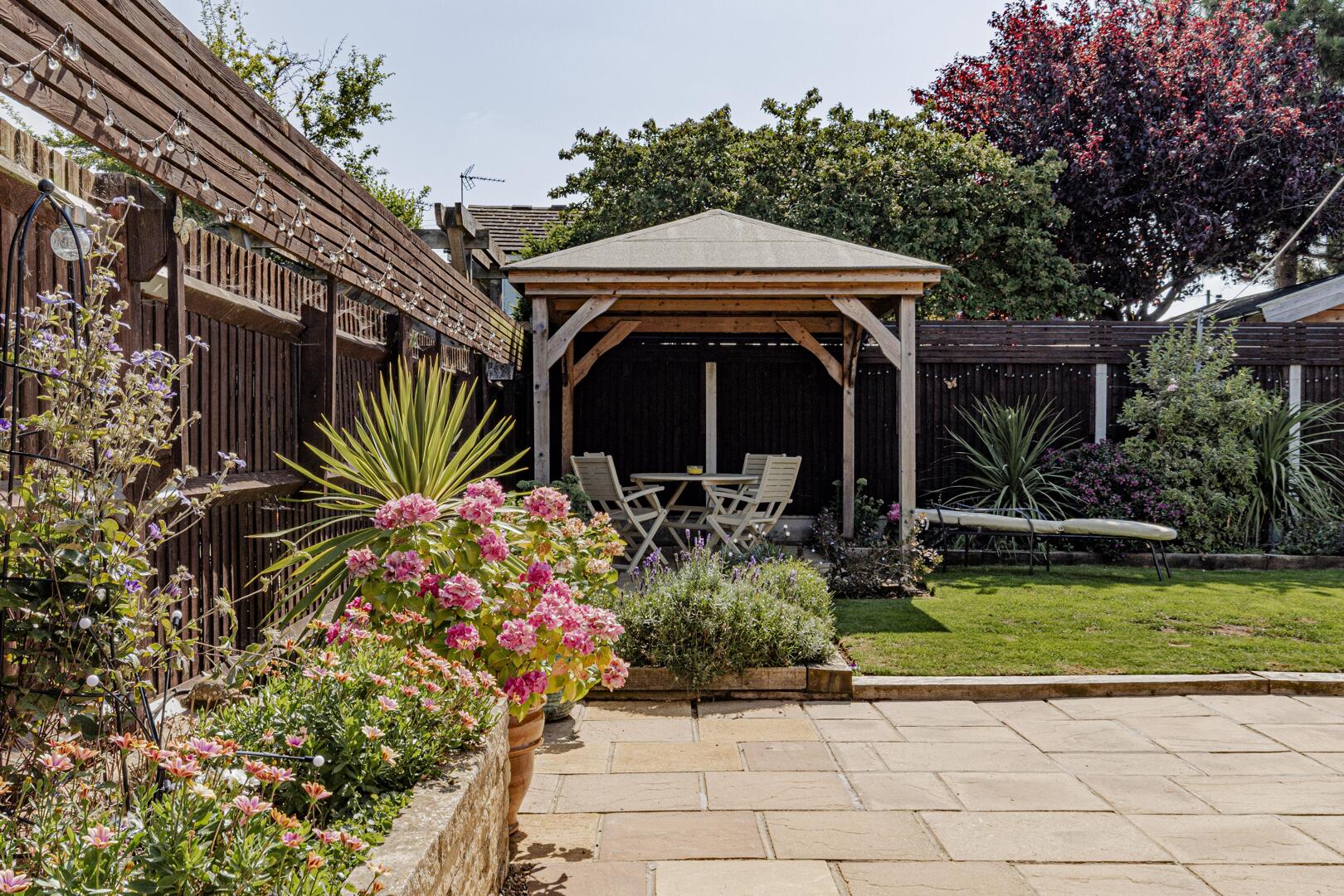 To the rear, you’ll discover a low-maintenance garden complete with a solid wooden gazebo, providing an attractive and sheltered space for outdoor dining, morning coffees, or simply enjoying the fresh air. The detached garage fitted with lighting and electrics offers fantastic potential as a workshop, hobby space, or secure storage solution.