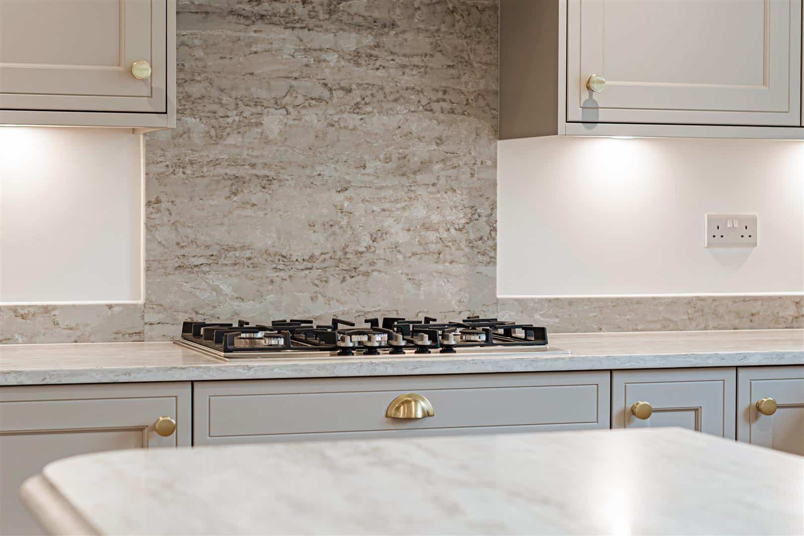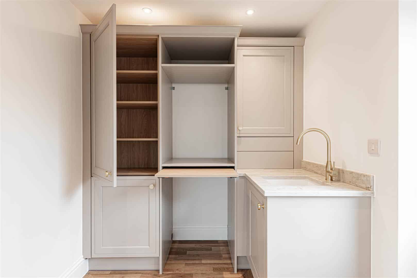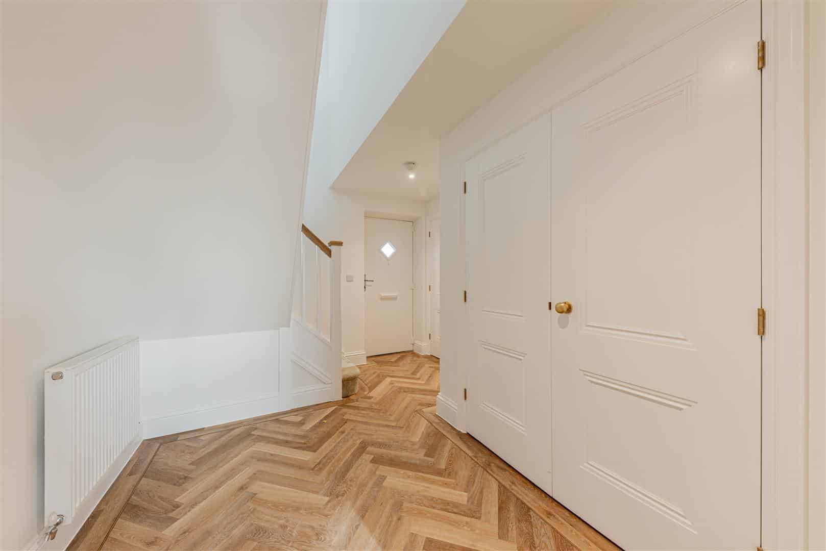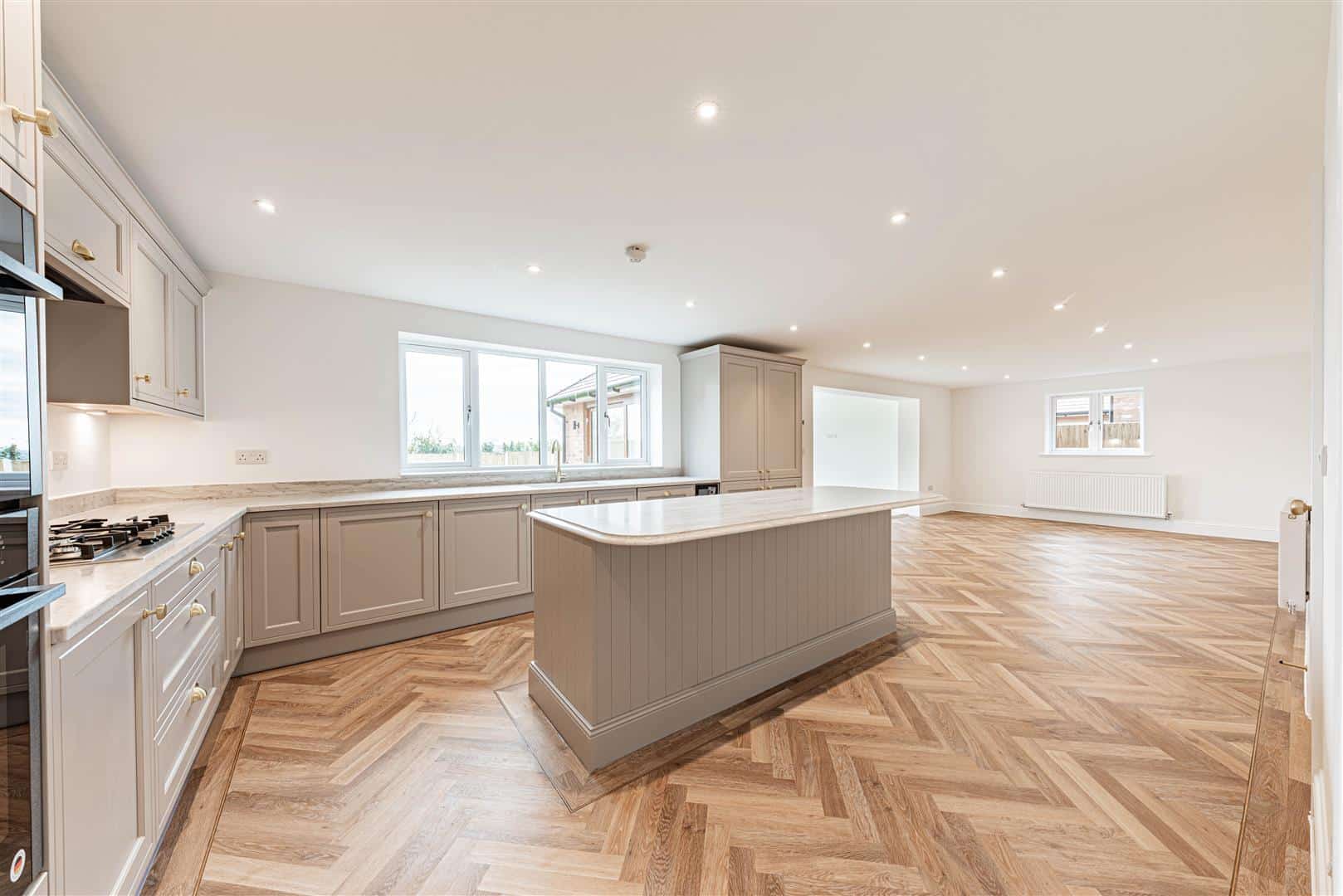 As you enter this impressive home, you step into a light spacious entrance hall which leads to a cloakroom/WC, a large open plan kitchen/diner and a bright and spacious lounge with dual aspect views of the garden. The bespoke fitted kitchen comes with a peninsula, beautiful quartz worktops and integrated appliances, which includes a full height fridge, full height freezer, dishwasher, oven and gas hob with large sliding doors leading out the garden. The utility room has fitted cupboards, space for a washing machine, tumble dryer and further access into the garden.