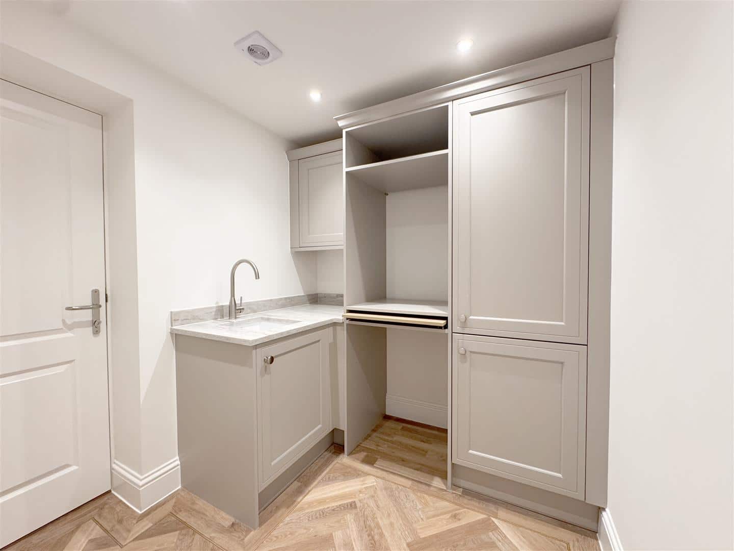 As you enter this stunning home, you step into a light spacious entrance hall which leads to a generous sized lounge, cloakroom/WC and a spacious open plan kitchen/diner with doors leading out to the garden. The bespoke fitted kitchen comes with a peninsula, beautiful quartz worktops and integrated appliances, which includes a fridge/freezer, dishwasher, oven & gas hob. The utility room has fitted cupboards, space for a washing machine & tumble dryer, with further access into the garden.